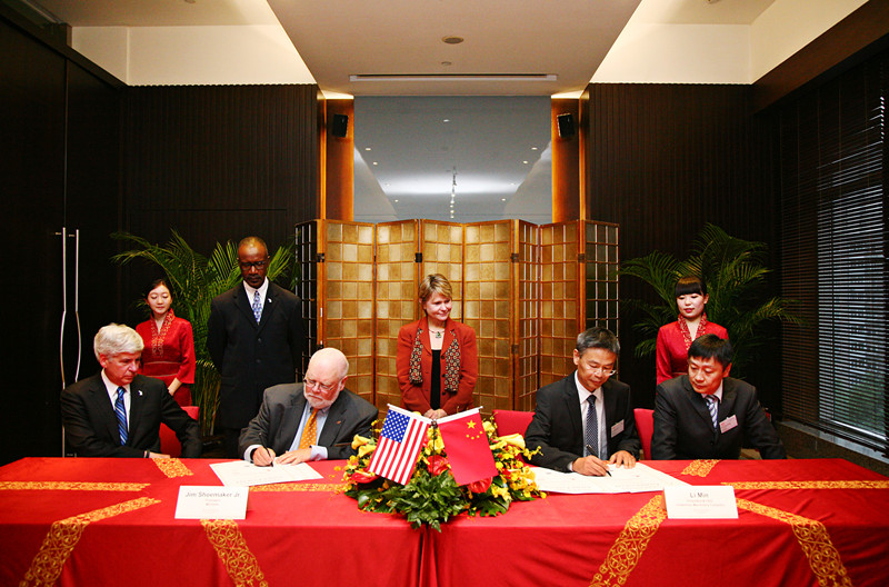2013年9月11日晚6:10分,美國木霸克粉碎機(jī)公司與綠友集團(tuán)的簽約儀式在北京洲際大飯店(金融街)水晶廳舉行。美國密西根州州長Rick Snyder(里克·斯奈德)先生及密西根州政府一行人,木霸克公司總裁James W. Shoemaker Jr. (詹姆斯·舒梅克)先生、木霸克公司市場營銷副總裁John Foote(約翰·富特)先生、木霸克公司國際銷售經(jīng)理Ryan Sanders(瑞安·桑德斯 )先生、Curt McMullen(科特·麥克姆倫)先生、綠友集團(tuán)總裁李敏先生、副總裁劉軍先生、總裁助理和新先生參加了簽約儀式。