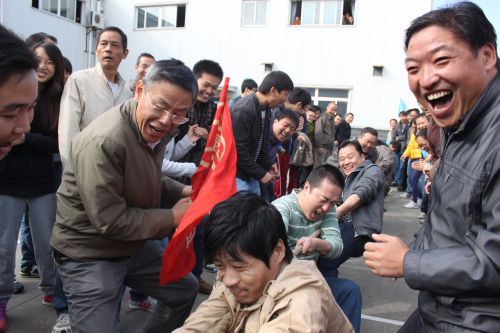 拔河比賽是最考驗(yàn)團(tuán)隊(duì)凝聚力的項(xiàng)目了。裁判員一聲令下,所有的選手勁往一處使,勒緊麻繩不放松,在強(qiáng)有力的“1、2、3”的口號(hào)下,每個(gè)參賽者使出九牛二虎之力,把繩子往自家起點(diǎn)線邊拉。只見繩索中心的紅線忽而左忽而右,參賽選手們絲毫不放松,腿彎了、差點(diǎn)就坐在地上了,大家又一股力量地往回拉。圍觀的同事們急得直跺腳,嘴上喊著“加油、加油”,手還一直往一邊“推”,好像自己也在拉著比賽繩一樣。在這場(chǎng)力量與意志的比拼中,拓寶二、營銷二部、草坪灌溉聯(lián)合組奪得了最后的勝利。