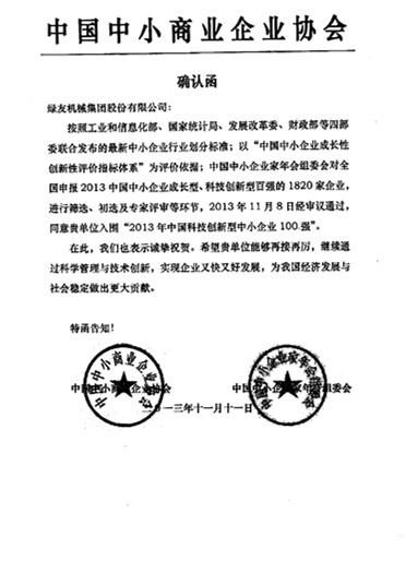 綠友榮獲“2013年中國科技創(chuàng)新型中小企業(yè)100強” 確認(rèn)函:
