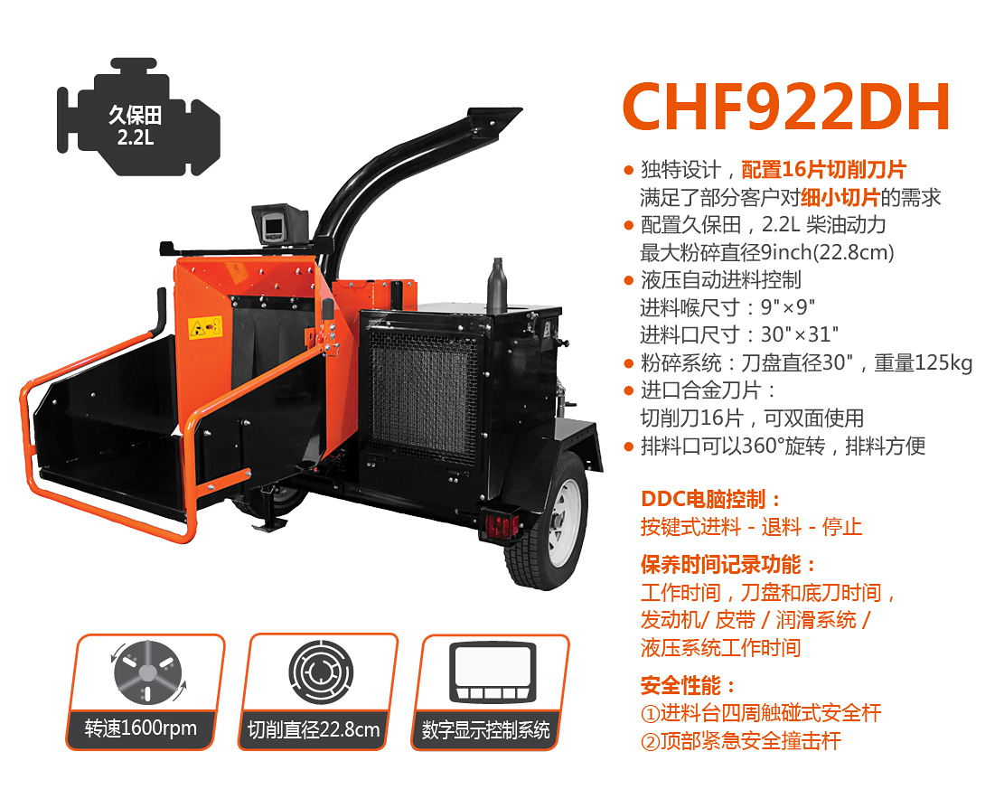 老熊(BEARCAT)品牌樹枝粉碎機(jī),配置久保田2.2L柴油機(jī),動力更強(qiáng)勁,最大可切削直徑23cm樹枝;智能液壓進(jìn)料系統(tǒng)可自動監(jiān)控發(fā)動機(jī)轉(zhuǎn)速和進(jìn)料狀態(tài),根據(jù)進(jìn)料負(fù)荷的大小自動調(diào)整進(jìn)退料;噴料口可360度旋轉(zhuǎn),隨意選擇噴料方向;切削刀片經(jīng)過特殊處理,堅固耐用并可多次修磨。